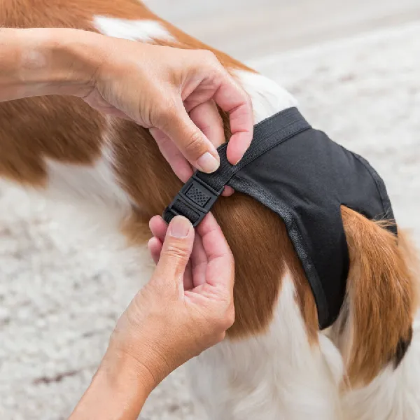 - Coloque una compresa en la malla interior y ajuste la tira alrededor del abdomen de su perra.