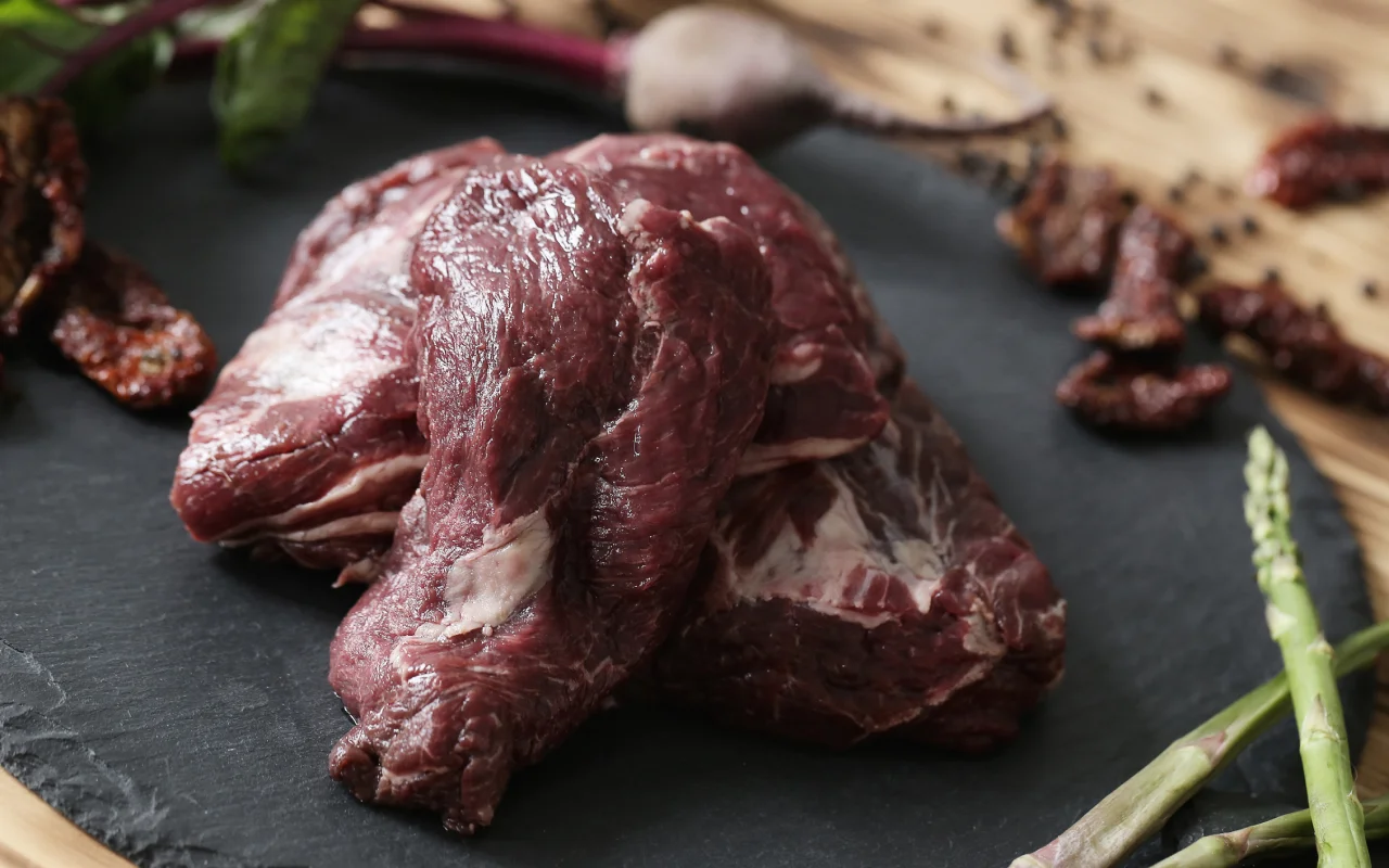 Dos cortes de carne de caballo cruda, ideal para la alimentación saludable de perros, rica en nutrientes esenciales para su bienestar