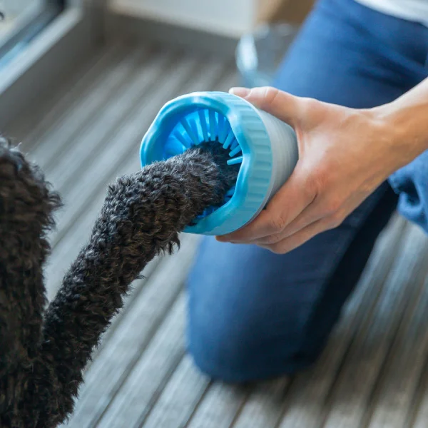 - Coloca el limpiador de patas en lugares estratégicos como la entrada principal o el patio, donde tu perro suele pasar después de los paseos.