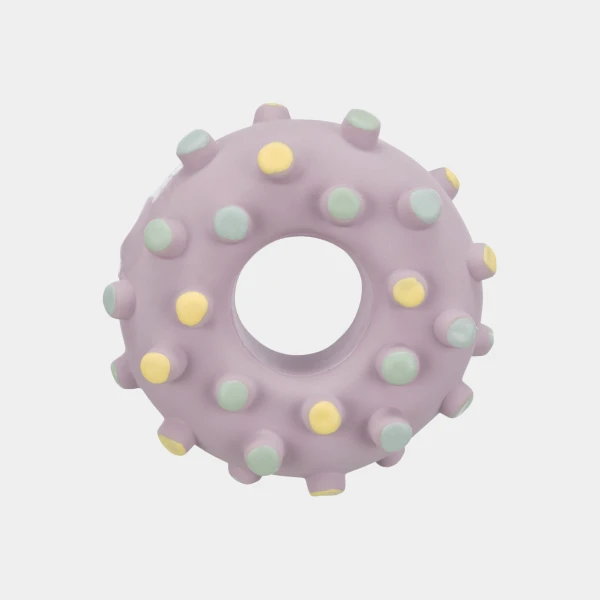 - Diseño en forma de donut: su forma circular y colorida, en púrpura con tacos amarillos y menta, es visualmente atractiva y fácil de agarrar para los cachorros.